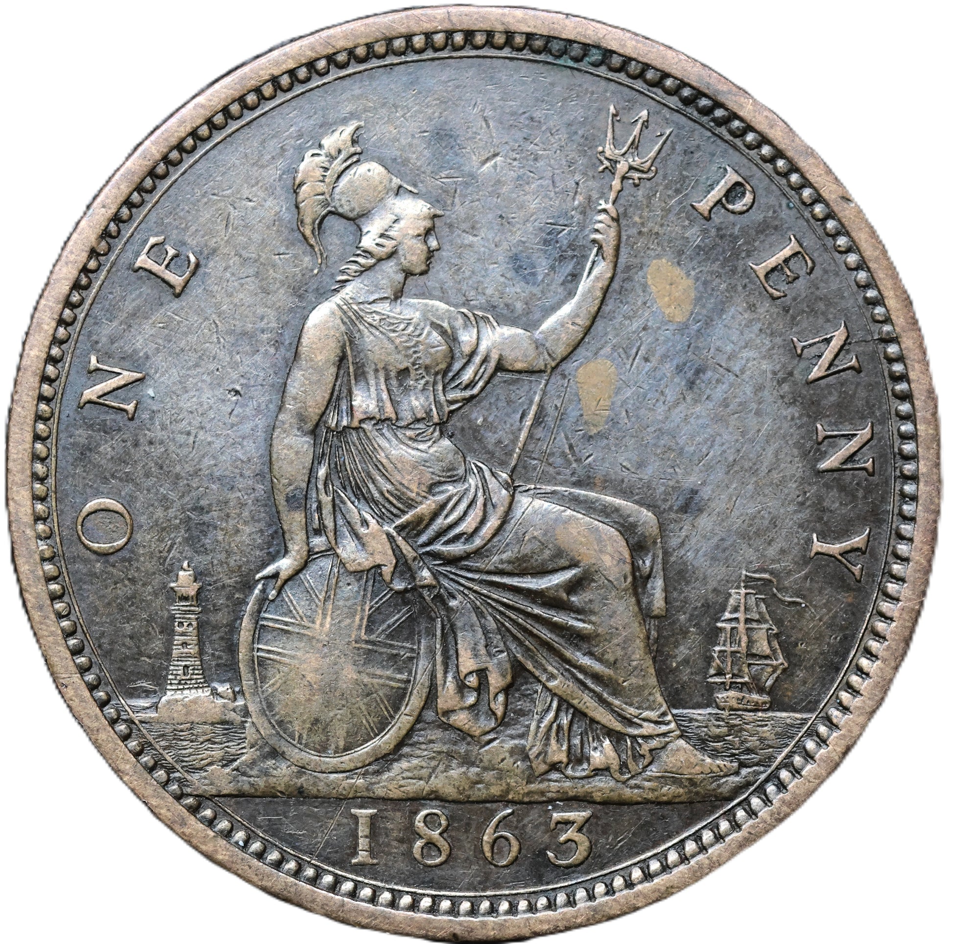 Reverse: Britannia seated facing right, holding trident and shield, with a lighthouse to the left and a sailing ship to the right. The word ONE PENNY above and the date 1863 below.