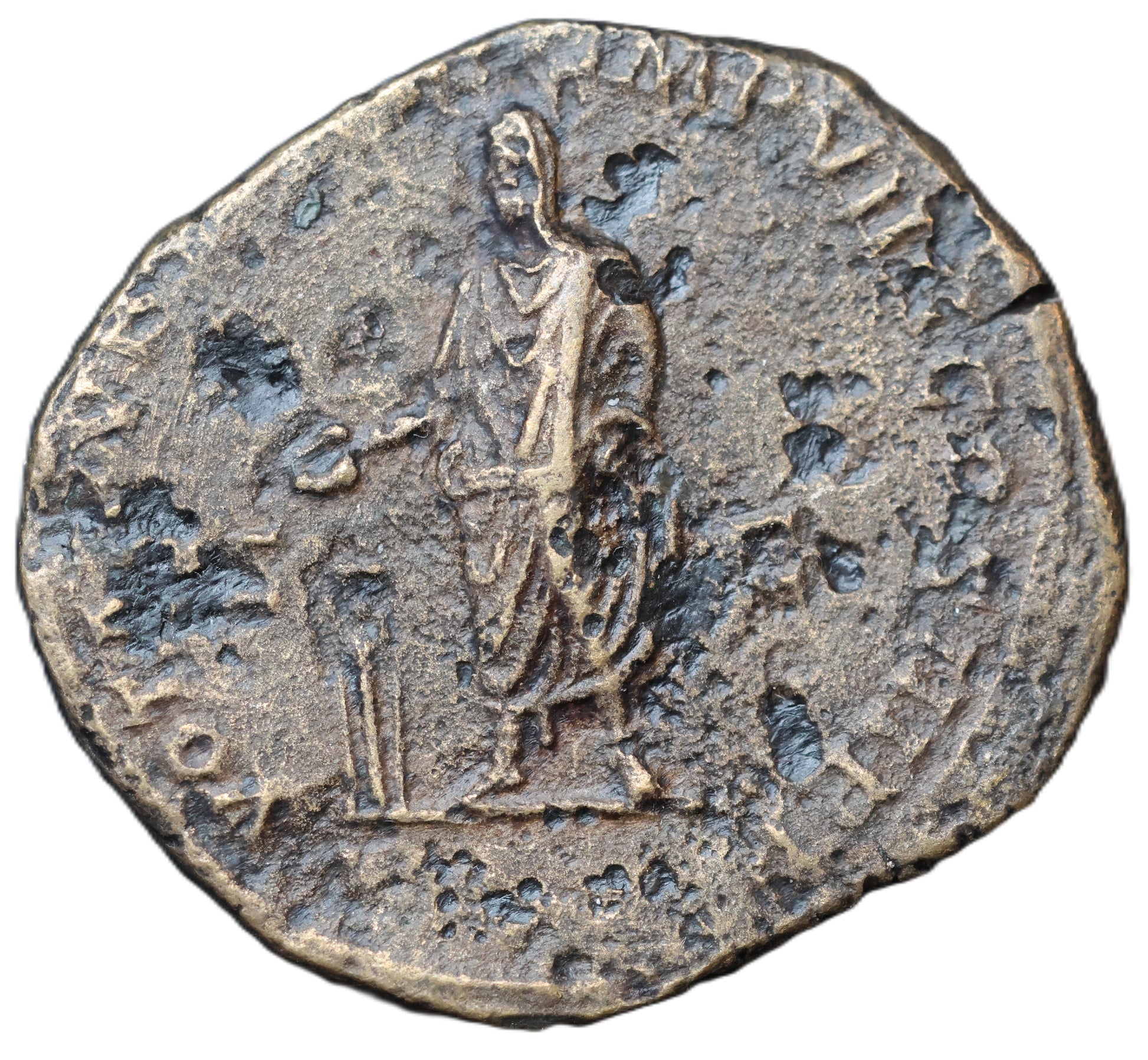 Reverse Legend: Partially visible, deity or female personification standing, holding attribute (possibly Pietas or Providentia)